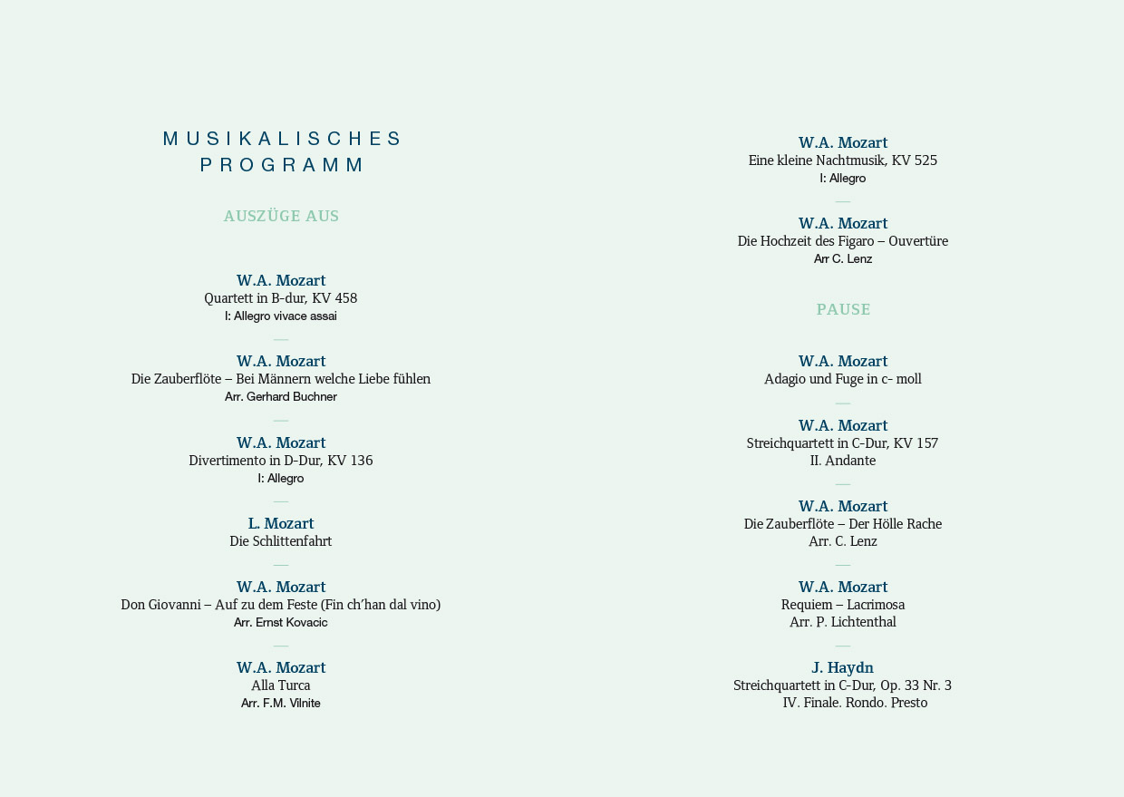 Musikalisch umrahmt wird der Abend vom großartigen Streichquartett Sonare mit Auszügen aus Kompositionen von W.A. Mozart, L. Mozart und J. Haydn.